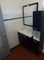 La salle de bain comprend douche, espace lavabo avec meuble et un emplacement pour une machine à laver.